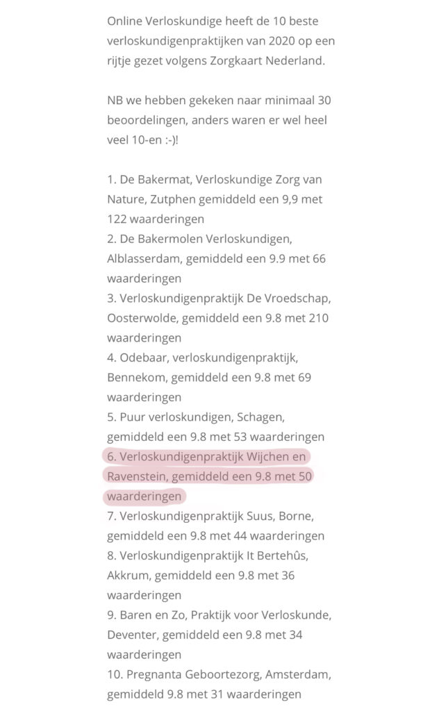 Vandaag heeft Online Verloskundige een overzicht gemaakt van de beste praktijken volgens Zorgkaart Nederland. Wij staan op nummer 6 van Nederland!! Met een gemiddeld cijfer van een 9.8. We zijn wel een beetje overrompeld hierdoor. Wat lief dat er zoveel mooie waarderingen zijn geschreven over onze verloskundige zorg, zeker dit afgelopen jaar.