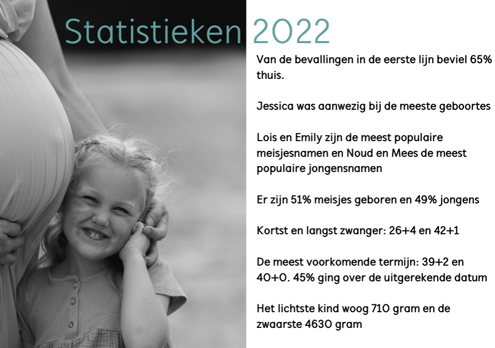 Ondanks dat 2022 een lastig jaar is geweest met moeilijke momenten zijn er ook vele mooie momenten geweest. Net als elk jaar zijn de vele prachtige geboortes het hoogtepunt! Naast Jessica haar eigen bevalling mocht ze de meeste geboortes meemaken dit jaar! Wat zijn we blij dat we dit vak mogen uitoefenen en we gaan voor nog vele mooie jaren!