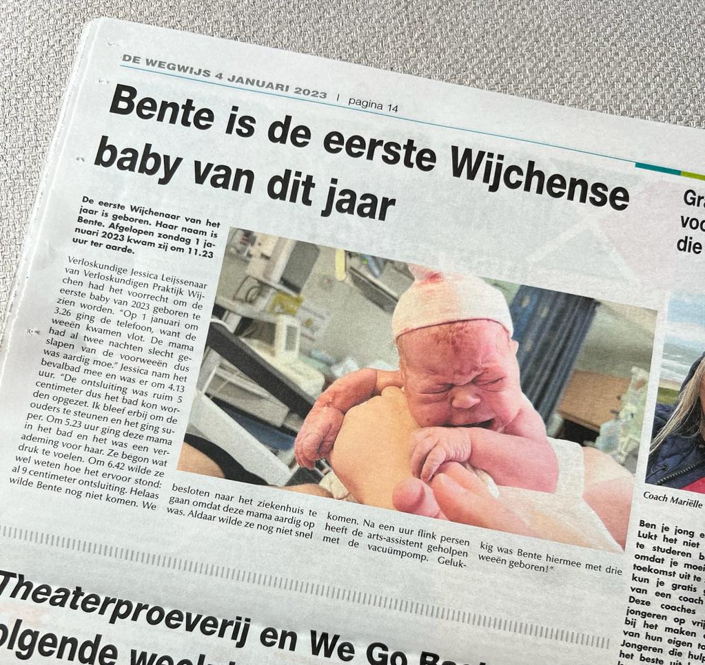 Jessica had het voorrecht onze eerste baby van 2023 geboren te zien worden! Dit mooie meisje maakt een mooie start voor 2023!! In de nacht om 3.26 uur ging de telefoon want de weeën kwamen nu vlot. Deze mama had al twee nachten slecht geslapen van de voorweeën dus was aardig moe. Jessica nam het bevalbad mee en was er om 4.13 uur. De ontsluiting was ruim 5 centimeter dus het bad kon worden opgezet. Jessica bleef erbij om deze ouders te steunen en het ging super! Om 5.23 uur ging deze mama in het bad en het was een verademing voor haar. Ze begon wat druk te voelen. Om 6.42 wilde ze wel weten hoe het er voor stond: al 9 centimeter ontsluiting!! Dit ging goed. De persdrang mocht meer worden dus daar wachtten we op. Om 8.00 uur gingen we vanwege de vermoeidheid toch proberen te persen. Wie weet komt de kleine dieper. Helaas wilde ze nog niet komen. We besloten naar het ziekenhuis te gaan omdat deze mama aardig op was. Aldaar wilde Bente nog niet snel komen na een uur flink persen en heeft de arts-assistent geholpen met de vacuümpomp. Gelukkig was Bente hiermee met drie weeën geboren! Ze is de eerste baby geboren in het CWZ dit jaar en ook in onze praktijk!